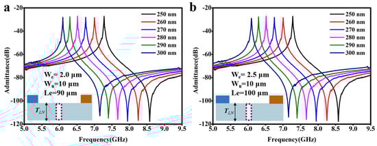 As mentioned in the introduction part, another advantage of the A1 resonators is that their operating frequencies are largely dependent on the thickness of the LiNbO3 thin film. By thinning the LiNbO3 thin film regionally, a single LiNbO3 thin film can have different thicknesses in different regions, thereby supporting A1 resonators with two or even multiple resonating frequencies. For variable thicknesses of the LiNbO3 thin films, the through-holes also have great applicability. Two randomly selected A1 resonators incorporating the through-holes were used as examples, and their admittance spectra were calculated for the variations of LiNbO3 thickness. The results are shown in Figure 6. Specific parameters of the resonators are marked in the figure. As can be seen, when thinning the LiNbO3 from 300 nm to 250 nm, no spurious mode appears in both two A1 resonators. At the same time, their resonant frequencies increase linearly.