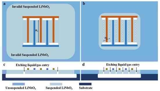 Firstly, the preparation convenience of the through-holes itself, i.e., the introduction of the through-holes, does not add additional process steps. To prepare such Lamb wave resonators, it is usually necessary to etch several release windows on the piezoelectric (e.g., LiNbO3) thin film [31,42]. All through-holes can be fabricated simultaneously.