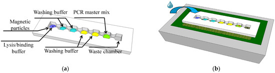 Nucleic acid-based diagnostics is rapidly expanding and has various applications in infectious disease diagnosis, pharmacogenomics, oncology, and genetic testing. Miniaturized total analysis systems (μTAS) for genetic assays have been developed by using microfluidic technologies, which integrate nucleic acid extraction, amplification, and detection [1]. Microfluidics, i.e., continuous fluid flow or droplet-based actuation, has been introduced to develop μTAS for biomedical applications successfully. Although these two approaches are promising, their dependence on equipment for point-of-care testing (POCT) remains a major challenge in real-world biosample tests. In such applications, droplet-based chips have shown significant potential for storing and processing samples and reagents without the aid of pumping devices. Recently, a considerable amount of attention has been paid to droplet-based microfluidics, also known as digital microfluidics. Droplets not only serve as reaction chambers and transportation units but also as self-contained systems. In addition to their simplicity, portability, and ability to store samples and reagents on chips, droplet-actuated platforms are particularly useful for POCT. Droplet movement is effectively controlled by numerous actuated methods, including electrowetting on dielectric [2], thermocapillary force [3], surface acoustic waves [4], electrophoresis [5], optical force [6], and magnetic force [7,8,9,10,11,12]. Among all actuation devices, magnetic-actuated droplet manipulators [7,8,9,10,11,12] exhibit some advantages due to their flexibility, long distances, high driving forces, and easy use. Using droplets as micro-reactors, reagents can be transported, merged, mixed, and analyzed effectively [13,14].