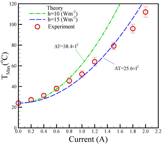 Experimental maximum temperature (TMax) versus different applied currents. The surrounding temperature (T∞) is 25 °C.