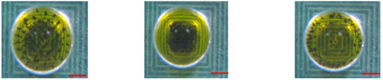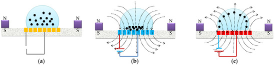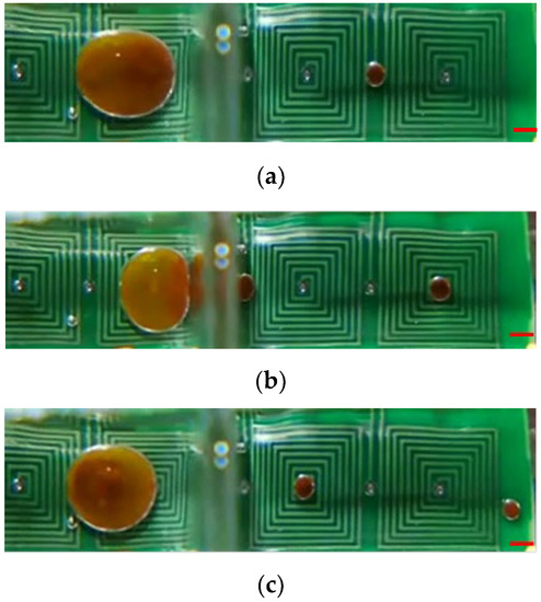 Instead of using the continuous scheme for bioapplications, magnetic beads surrounded by droplets were prepared to solve the problems mentioned above. Currently, several actuations, i.e., permanent magnets [8,9] or planar coils [7,10,11,12], were used to transport, split, and merge droplets containing magnetic beads. Consequently, this approach significantly shortened time and reduced costs when trial-and-error methods were used for genetic analysis. A variety of commercially available reagents and surface-coated particles have been utilized to perform on-chip DNA extraction and purification from crude biosamples [7,8,9,11,12]. Microparticle encapsulation, sequential fusion, rapid mixing, and dilution have successfully demonstrated in conventional droplet-based microfluidics. In continuous microfluidics, unbound reagents are washed from magnetic particles by serial dilution. Recently, advanced on-chip techniques have been successfully demonstrated for multistep binding and washing steps on magnetic particles by traversing multilaminar reagent streams [22,23,24]. Recently, millimeter-sized ‘ferrobots’ were tested for precise manipulation of magnetized droplets and delivery of workflows related to nucleic acid amplification [25]. However, despite recent advancements in magnetic handling, isolating magnetic beads for bioassays can be difficult due to the limited reconfigurability and compartmentalization of magnetic beads. Moreover, the short traversing times between multilaminar flow streams limit increasing incubation time with reagents for postprocessing. Therefore, a robust and simple washing step on a digital droplet-based microfluidics platform for magnetic particle-based assays is in high demand. In contrast to continuous flow and electrowetting-based microfluidic systems, in-droplet microparticle separation systems have rarely been investigated.