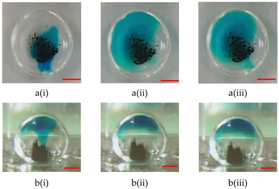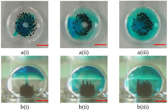 (a) Top-side view and (b) lateral sides views of photographic sequences showing mixing performance under magnetic bead agitation at the different times of (i) t = 0 s; (ii) t = 2.0 s, and (iii) t = 4.0 s. The conditions for this operation are as follows: a DC current of 1.5 A, a 2.88-μm magnetic beads’ mass of 100.0 μg, and an alternate frequency of 1.0 Hz. The red scalar represents 1.0 mm.