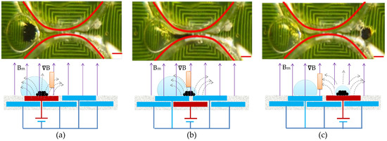 Illustrations depicting the (a) release, (b) attraction, and (c) repulsion of magnetic beads within a droplet. The red scalar represents 1.0 mm.