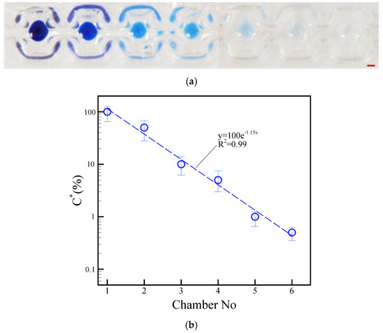 We estimated the color intensity of the blue dye carried over between each a droplet to evaluate the effectiveness of the washing process. The neck-shaped channel had a gap of 500 μm and a length of 1500 μm. The washing process involved the motion of a droplet, agitation of magnetic beads within a droplet, and extraction of magnetic beads from a droplet. The blue dye intensity of a droplet indicates how well the magnetic beads have been washed after each step. Incomplete washing is indicated by higher intensity. By contrast, lower intensity indicates more complete washing. The effect of washing was evaluated by measuring the mean gray value of the blue dye in compartment 1 against serial dilutions of the buffer. A DC current of 1.5 A was applied to split microparticles from a droplet, and 1.5 A was applied to agitate magnetic beads inside a droplet. The driving frequency was also set to 1.0 Hz. The magnetic particles were washed in order from compartment 2 to compartment 6 after separating them from compartment 1 containing blue dye. In the first chamber, a 15 µL droplet of blue dye was dispensed. Six 15 µL transparent droplets were dispensed in the second to sixth compartments as previously shown in Figure 1a. We use a 20 μL droplet, consisting of 15 μL water and 5 μL dye, due to its compatibility with our planar coil and the visibility it offers for real-time performance analysis. A DC current of 1.5 A with an alternation frequency of 1.0 Hz was applied during eight agitation cycles to distribute the dye in each compartment uniformly. By using a DC current of 1.5 A and a frequency of 1.0 Hz, the magnetic beads inside a droplet were actuated across the neck-shaped channel to split from the previous droplet. The intensity of a blue-colored droplet depends on the magnetic beads that carry liquid dye to the next droplet. The blue dye was also uniformly distributed within the next transparent droplet through the agitation of the magnetic beads. The dye intensity of the droplet should have reduced compared with that of the previous droplet. The dye intensity images of the first droplet were compared with those of the following droplets to quantify the amount of liquid carried by the magnetic beads during the washing process. The intensity of blue dye in different chambers is shown in Figure 11a. Moreover, a graph showing the normalized concentration of blue dye in each chamber can be seen in Figure 11b. These two parameters are related by the Eq. C* = 100e−1.15N. The coefficient of determination was R2 = 0.99. Here C* represents the normalized concentration, and N represents the washing chamber. The continuous images show that the magnetic beads inside a droplet successfully separated from their previous parent droplet to perform the washing effect. Supplementary Video S5 presents the washing sequence of the magnetic beads inside the droplets.
