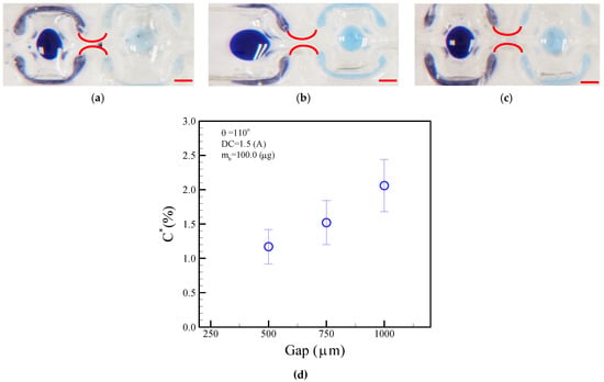 Normalized concentration of blue dye after the fourth washing process in different neck-shaped channel gaps of (a) 500, (b) 750, and (c) 1000 μm. (d) Concentration of droplet normalized in accordance with different neck-shaped gaps. The operational conditions are set as follows: a DC current of 1.5 A, a bead mass of 100.0 μg in the droplet, and a frequency of 1.0 Hz alternation for the adjacent coil. The red scalar represents 1.0 mm.