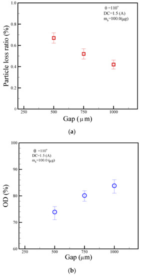 The relationship of (a) particle loss ratio and (b) optical density (OD) with respect to different gap sizes of 500, 750, and 1000 μm. The operational conditions are set as follows: a DC current of 1.5 A, a beads’ mass of 100.0 μg in the droplet, and a frequency of 1.0 Hz alternation for the adjacent coil.