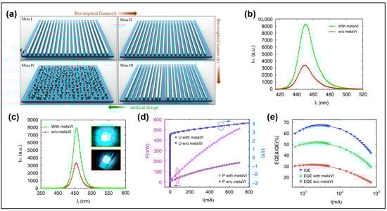 - Mao, P.; Liu, C.; Li, X.; Liu, M.; Chen, Q.; Han, M.; Maier, S.A.; Sargent, E.H.; Zhang, S. Single-step-fabricated disordered metasurfaces for enhanced light extraction from LEDs. Light Sci. Appl. 2021, 10, 180. [Google Scholar] [CrossRef]