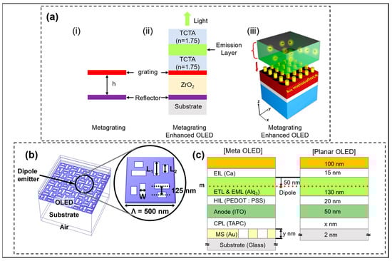 - Xu, X.; Kwon, H.; Finch, S.; Lee, J.Y.; Nordin, L.; Wasserman, D.; Alù, A.; Dodabalapur, A. Reflecting metagrating-enhanced thin-film organic light emitting devices. Appl. Phys. Lett. 2021, 118, 053302. [Google Scholar] [CrossRef]