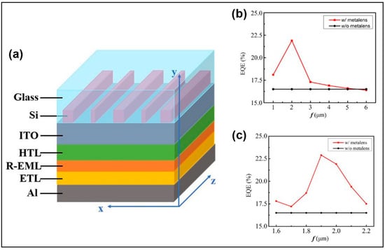 - Lin, J.G.; Sun, Q.; Feng, W.B.; Guo, S.M.; Liu, Z.h.; Liang, H.W.; Li, J.T. Enhancing the Light Extraction Efficiency in Micro-Organic Light-Emitting Diodes with Metalens. Adv. Photonics Res. 2021, 2, 2000145. [Google Scholar] [CrossRef]