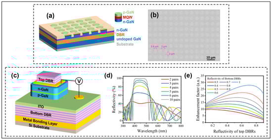 | Improve LEE and enhance spectral narrowing | Micro-LED | 450~660 nm | Bottom NP GaN/undoped GaN DBR reflectors | Experiment | [38] |