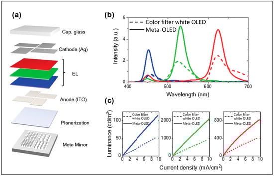 - Kang, K.; Im, S.; Lee, C.; Kim, J.; Kim, D. Nanoslot metasurface design and characterization for enhanced organic light-emitting diodes. Sci. Rep. 2021, 11, 9232. [Google Scholar] [CrossRef]