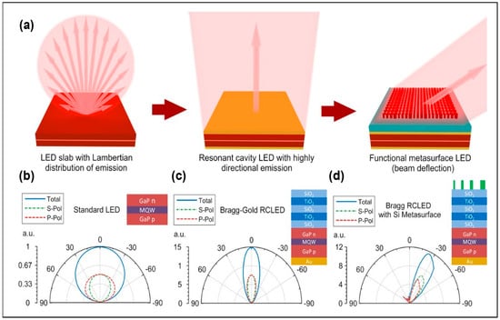 - Khaidarov, E.; Liu, Z.; Paniagua-Domínguez, R.; Ha, S.T.; Valuckas, V.; Liang, X.; Akimov, Y.; Bai, P.; Png, C.E.; Demir, H.V.; et al. Control of LED emission with functional dielectric metasurfaces. Laser Photonics Rev. 2020, 14, 1900235. [Google Scholar] [CrossRef]