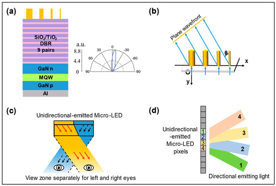 - Huang, J.; Hu, Z.; Gao, X.; Xu, Y.; Wang, L. Unidirectional-emitting GaN-based micro-LED for 3D display. Opt. Lett. 2021, 6, 3476–3479. [Google Scholar] [CrossRef]