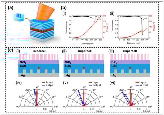 - Huang, H.; Zheng, S.; Sun, W. Beam manipulation for quantum dot light-emitting diode with an Ag grating and a phase-gradient metasurface. Opt. Express 2022, 30, 28345–28357. [Google Scholar] [CrossRef] [PubMed]