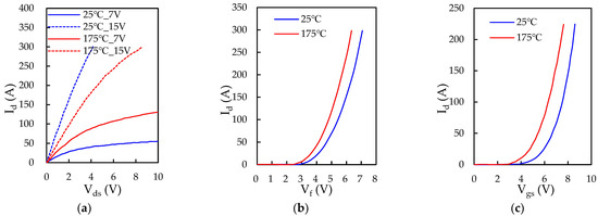 Characteristics of the SiC power MOSFETs: (a) Output characteristic; (b) Diode characteristic; (c) Transfer characteristic.