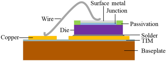 IC substrates and cooling systems are the primary heat dissipation passages of PMs. A proper selection of substrate materials and the use of effective cooling systems are critical to the device’s thermal performance and even thermal–mechanical reliability. DBC alumina (Al2O3 and AlN) ceramic substrates have been widely used in various power electronics applications due to technology maturity, good thermal and mechanical performances, and even low production costs, especially the Al2O3 DBCs. As a result of a lack of an oxide layer for copper (Cu) bonding, the production cost for the AlN DBCs is markedly higher than that of the Al2O3 ones because of the greater manufacturing difficulty and lower yield despite having superior thermal performance. Moreover, these insulators are brittle in nature and thus vulnerable to stress cracking [20,21]. It is worth noting that a thicker insulator causes not only higher electrical insulation but also greater thermal resistance, which is not ideal for high power applications. To address these challenges, several different types of substrates were proposed, including insulated metal substrates (IMS), Si3N4, direct plate copper (DPC), etc. Among them, IMS is an attractive alternative as a result of its low cost in manufacturing, the good mechanical property of the insulation layer, great efficiency in layout usage, and even superior thermal and electrical performances [21,22]. Their thermal performance can be upgraded through the use of a thinner dielectric layer though this may unfortunately lead to a lower electrical resistance [23]. It was reported that a Cu- and Al-based IMS substrate with an insulating layer (IL) thickness of 0.12 mm outperforms an Al2O3 DBC substrate with an IL thickness of 0.38 mm in thermal performance [22].