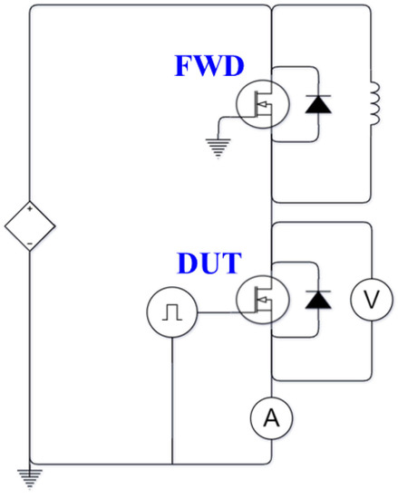 The DPT is currently the most commonly used method for testing transistor switching characteristics. This method is numerically and experimentally applied to explore the switching characteristics of the SiC power MOSFET devices, and the results are compared with each other. For the DPT experiment, the measurement circuit is depicted in Figure 6. The experimental equipment includes a high-voltage power supply, a high-frequency oscilloscope, a high-voltage differential probe, a function generator, a Rogowski coil current probe, a load inductor, a gate driver board, and a power board. In the experiment, a half-bridge circuit structure is required, principally owing to that one switch needs to act as a freewheeling diode (FWD) to provide a current path for the freewheeling current as the switch is turned off, and the other switch acts as the device under test (DUT) for switch control. The gate of the SiC MOSFET device serving as the FWD is short-circuited to the source, while the gate and source terminals of the DUT are connected to the control board. The gate driver circuit can provide a gate-source voltage (Vgs) in the range of −4.0~15 V for driving the SiC MOSFET device. Finally, a current probe is connected in series between the DC capacitor and the drain of the DUT, and a high-voltage differential probe is connected in parallel with the DUT, for measuring the source current (Id) and the source-drain voltage (Vds) of the DUT, respectively. The control signal can be divided into two square waves, where the duration of the first pulse is mainly determined by the rated current and the voltage values, as well as the load inductance. Based on the inductor voltage and the current relationship, the load current is found to be 200 A with a load inductance of 39 nH, the DC bus voltage 600 V, and the pulse width is 75 µs. As soon as the Id reaches the rated current value, the SiC MOSFET device turn-off waveform can be measured by detecting the gate-to-source voltage signal. During the turn-off period, a current path is formed from the load inductor to the body diode, allowing the load current to remain almost constant, ensuring it reaches the rated current as the DUT is switched on during the second square wave. The measured turn-off and turn-on waveforms disclose the switching time and switching characteristics of the SiC MOSFET device. To facilitate the comparison in switching characteristics among different PSDs or PMs, the international standard IEC 60747-8 [33], that define the switching characteristics, can be adopted.