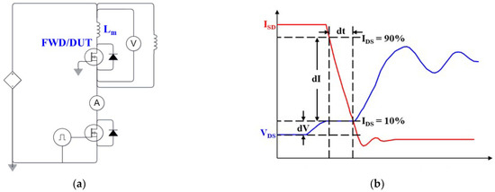 Inductance measurement: (a) Measurement circuit; (b) Schematic diagram of a typical switching waveform at FWD turn-off.