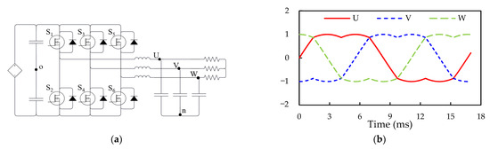 Space Vector Pulse Width Modulation: (a) Circuit; (b) Modulation waveforms of phase U, V, and W.