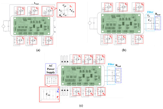 Proposed ECC model for electrical characterization and power loss estimate: (a) DPT; (b) SiC inverter; (c) SiC/Si iHPM.