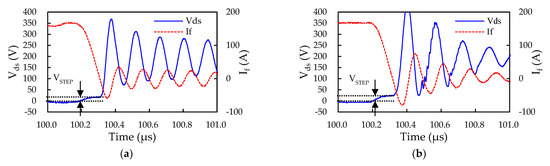 The extracted parasitic inductances of the current paths, P-O1, O1-N, P-O2, O2-N, P-O3, and O3-N (O1,O2,O3), of the inverter are presented in Table 2. It can be observed from this table that the upper arm of the W phase (P-O3) has the highest parasitic inductance value, whereas the lower arm of the U phase (O1-N) exhibits the lowest one. This may mainly be because the O1-N path has the shortest current path, while the P-O3 path possesses the longest one, as can be seen in Figure 10. Moreover, the parasitic inductances of the P-N paths of the three phases are all less than 20 nH, which suggests that the current Cu trace layout design of the IMS substrate meets the design specification. Additionally, the parasitic inductances of the P-N paths of the three phases are all lower than those of the other conducting paths, i.e., P-Oi and Oi-N (i = 1,2,3), indicating that the Cu trace layout design turns out to be fairly successful in suppressing the parasitic inductances through the mutual coupling. For validation, the parasitic inductances of the conducting paths, P-Oi and Oi-N (i = 1,2,3), of these three phases are also characterized from the DPT experiment. Since the iHPM is configured in a three-phase bridge configuration, which shares the same positive (P) and negative (N) terminals, and also because the DUT is a power MOSFET body diode, which has no turning-off function, the loop parasitic inductance (P-N) cannot be obtained from the DPT experiment. Figure 12a,b display the measured turn-off waveforms of the body diodes of the power switches on the high side (P-O1) and the low side (O1-N) of the U phase, respectively. As can be seen in Figure 12a, the measured voltage step VSTEP and the rate of the current change in the conducting path P-O1 during the ON time of the U-phase upper arm are 16.6 V and 1.6 A/ns, respectively. Table 3 presents the measured voltage steps, the rates of change in the current, and parasitic inductance values associated with these six current conducting paths in the three-phase SiC inverter. By comparing the simulated (Table 2) and measured parasitic inductance (Table 3), we detect that there is a very good consistency between them, with a maximum difference of only around 12.5% appearing at the P-O1. The maximum current carried by these Al wires ranges from 19 A to 22 A, which is less than their fusing current by around 29 A, according to the vendor data. Clearly, the currently developed iHPM remains within a safe range, primarily because the given load current condition is 200 A, which is the rated current value of the module.