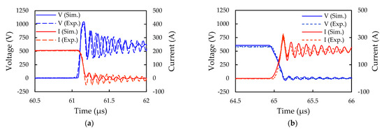 Modeled and measured voltage and current transient waveforms of the SiC/Si iHPM: (a) Turn-on; (b) Turn-off.