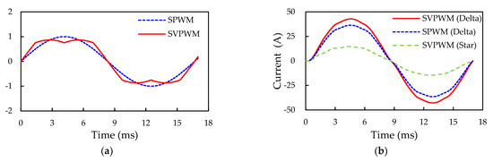 SVPWM and SPWM are two of the most widely applied modulation schemes to control the output load voltages and currents for VFD applications. In this work, both are implemented to drive the voltage source three-phase inverter. Figure 15a summarizes the time functions of the generated SPWM and SVPWM modulating signals. As seen in the figure, the modulating signal for SVPWM has a wider wave crest compared with that of SPWM, thereby achieving more output voltage and better DC link voltage utilization than the SPWM control. The U-phase output line current of the inverter with SVPWM and SPWM controls are reported in Figure 15b. The red and blue lines represent the output line currents in a delta-connected load with SVPWM and SPWM control. The results illustrate that the RMS output line current (IL(rms)) are 30.4 A and 25.7 A for the SVPWM and SPWM controls, respectively. The output line current for the SVPWM control is slightly higher than that of the SPWM control, indicating that the SVPWM control yields higher output power under the same conditions. Moreover, Figure 15b also presents the output line current of the star-connected inverter with the SVPWM control. With the same SVPWM control signal, the peak output line current drawn by a delta-connected load is approximately three times that of a star-connected load.