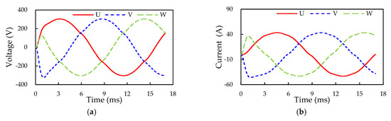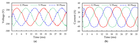 The open-loop three-phase output current and voltage and power loss of the SiC inverter in the SiC/Si iHPM are further examined using the proposed ECC model. The simulated output voltage and current waveforms of the three-phase inverter are given in Figure 16, which are displaced through a 120-degree phase shift with each other. The simulation employs the same DC voltage of 404 V and ambient condition (room temperature) as the experiment, giving rise to a DC current of around 28.8 A. With this DC voltage and current, the input power is estimated to be about 11.6 kW. The RMS line voltage (VL(rms)) and current (IL(rms)) are calculated as 210.6 V and 30.4 A, respectively, with which the output power is computed at around 11.1 kW. Based on the ratio of the output power and the input power, the efficiency of the inverter is determined to be around 95.5%.