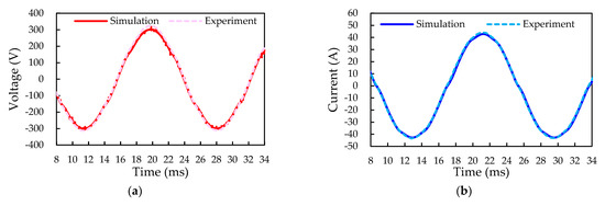 For validation of the simulation results, the U-phase output line current and the voltage and power loss of the SiC inverter with the SVPWM in an open-loop operation are experimentally characterized, and the results are depicted in Figure 17. There is a very consistency in waveform frequency between the simulation and experiment, but a slight difference in the amplitude of the output waveforms. This minor deviation may be also attributed to measurement-induced parasitics. In other words, the SVPWM control enables the production of pure sinusoidal waveforms of output voltage and current. The produced DC current from the SiC inverter under the 404 V DC voltage and room temperature experimental condition is around 30.3 A, with which the input power is computed at about 12.2 kW. The oscilloscope indicates that the measured VL(rms) and IL(rms) are 221.15 V and 30.49 A, respectively, with which the AC output power is calculated as approximately 11.7 kW. The conversion efficiency of the SiC inverter in the iHPM is 95.7%, which agrees well with the simulation result, i.e., 95.5%.