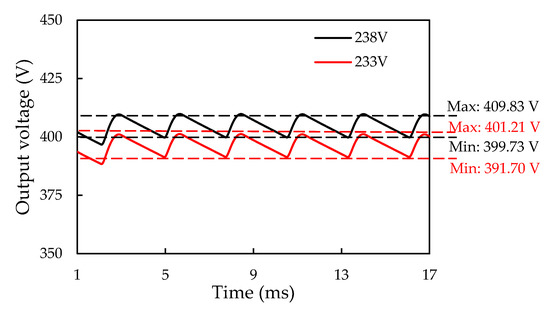 The electrical behavior and power loss of the SiC/Si iHPM during operation are evaluated through the proposed ECC model, as displayed in Figure 11c, which combines the functionalities of the three-phase rectifier and SiC inverter. For the open-loop operation of the three-phase iHPM, the switching frequency starts with 15 kHz. The other load conditions, such as the output power, the modulation index, the duty cycle, the dead time, and the output frequency, are identical to those used in the open-loop operation of the three-phase SiC inverter. In order to fulfill the 12 kW output power demand, the DC input voltage of the inverter needs to be maintained at 404 V. By using the formula for converting AC to DC voltage, the input line voltage for each phase is estimated to approximately 233 V to maintain 404 V DC bus voltage. With this input line voltage (i.e., 233 V), the generated DC output waveform from the three-phase rectifier from the three-phase (R, S, and T) AC voltage source is reported in Figure 18. It is clearly seen that the average DC voltage output from the three-phase rectifier is only about 396 V with a fluctuation of around 5 V. This by no means meet the goal, i.e., a DC bus voltage of 404 V, and this mainly arises from the diode losses of the rectifier and the parasitic parameters, and suggests that the input line voltage needs to be appropriately tuned. As the input line voltage is increased from 233 V to 238 V, the average output DC voltage can reach 404 V with the same fluctuation level, as also demonstrated in Figure 18.