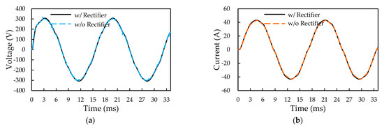 In Figure 18, a fair voltage fluctuation of about 5 V in the output DC bus voltage can be observed. It is essential to find out how this voltage fluctuation would affect the output voltage and the current of the inverter. The predicted inverter output voltage and current waveforms using the SiC inverter and the SiC/Si iHPM ECC models under the same three-phase operation conditions are displayed in Figure 19. It is worthwhile mentioning that, for the SiC inverter ECC model, a constant DC voltage of 404 V without the voltage fluctuation is applied. As can be seen in Figure 19a, there is an imperceptibly slight variation in the output voltage and the current waveforms between these two models, indicating that the voltage fluctuation has a trivial impact on the output voltage and current.