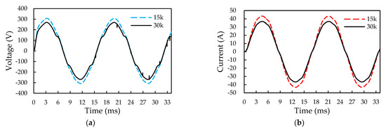 Output voltage and current waveforms at switching frequencies of 15 and 30 kHz: (a) Output voltage; (b) Output current.