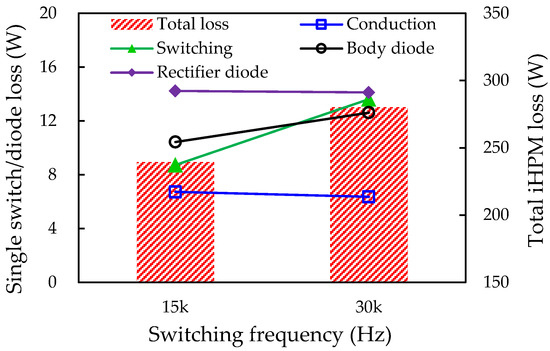 - For the three-phase iHPM operated at a switching frequency of 30 kHz, a DC voltage of 404 V, a load current of 28.8 A, and a room temperature condition, the switch switching loss is at its maximum at the chosen switching frequency, followed by the body diode loss and the switch conduction loss. The high switching frequency (30 kHz) and gate resistance (13 Ω) are the main causes of the extensive body diode loss. Moreover, the SiC inverter loss dominates the total power loss of the iHPM.