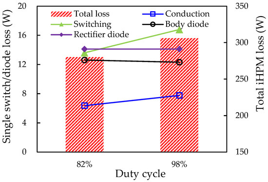 As the duty cycle increases from 82% to 98%, the output waveforms of the line voltage and the current of the three-phase SiC/Si iHPM are illustrated in Figure 22, where the values of the VL(rms) and IL(rms) are 219.9 V and 31.6 A, respectively. Noticeably, the output power is found to attain the target value of 12 kW at a duty cycle of 98%. Similarly, the corresponding total power loss also enlarges from 280.19 W to 305.99 W, as depicted in Figure 23, resulting from increased conduction, switching, and body diode losses. The individual inverter switch losses (conduction, switching, and body diode) as well as their sum, the individual rectifier diode loss, and the total power loss of the iHPM, are presented in Table 8. Based on Table 8, the average power losses of these inverter switches and rectifier diodes are 36.88 W and 14.12 W, respectively. Moreover, there is a very comparable power loss across the inverter switches and rectifier diodes. The average switching, conduction, and body diode losses of the inverter switches are approximately 45.6%, 21.0%, and 33.4% of their sum (i.e., the total power loss in a single switch), suggesting that the switching loss is at its maximum at the specified switching frequency, followed by the body diode loss and the conduction loss. Moreover, the body diode loss is very comparable to the switch switching loss at the chosen switching frequency. The cause of the significant body diode loss can be mainly attributable to the high switching frequency (30 kHz) and gate resistance (13 Ω). Of the total power loss of the iHPM, i.e., 305.99 W, the SiC inverter accounts for about 72.3% and the rectifier takes the remaining 27.7%.