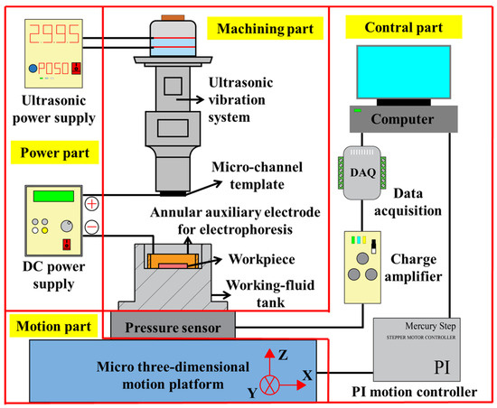 According to the principle of template-based electrophoretically assisted micro-ultrasonic machining, the experimental device shown in Figure 2 is designed, which consists of four parts: the power part, machining part, control part, and motion part. The power part includes an ultrasonic power supply and a DC power supply. The ultrasonic power supply supplies energy to the ultrasonic vibration system. The positive pole of the DC power supply is connected to the template tool, and the negative pole is connected to the annular auxiliary electrode. The machining part comprises an ultrasonic vibration system, a template tool, a workpiece, an annular auxiliary electrode, and a working fluid tank. The ultrasonic vibration system transmits the ultrasonic amplitude to the template tool through a piezoelectric ceramic sheet and ultrasonic horn. The template tool is a pre-processed micro-channel shape punch. The workpiece is a hard and brittle sheet material. The annular auxiliary electrode is a copper ring. After the DC power is turned on, an auxiliary electric field will be formed between the annular auxiliary electrode and the tool. The working fluid tank is filled with a solution mixed with ultrafine abrasive particles. It has a leveling function, which can minimize the parallelism error generated when installing the workpiece. The control part includes an industrial computer, data acquisition card, charge amplifier, pressure sensor, and PI motion controller. The real-time feedback voltage signal of the pressure sensor passes through the charge amplifier and is then sent back to the industrial computer by the data acquisition card. The industrial computer accurately controls the feed movement of the micro three-dimensional motion platform through the PI motion controller according to the real-time feedback pressure. The motion part is a micro three-dimensional motion platform, and the micro three-dimensional motion platform performs feed motion during machining.