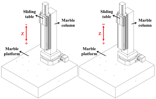 The three-dimensional diagram of the vertical sliding table is shown in Figure 3, composed of a marble column + sliding table. The marble column is installed on the marble platform. The sliding table adopts the structure of a screw + double guide rail. The selected servo motor has a self-locking function.