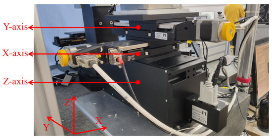 The micro three-dimensional motion platform is shown in Figure 4. It is installed and fixed on the marble platform. The strokes of the X-axis, Y-axis, and Z-axis are 102 mm, 102 mm, and 25 mm, and the minimum resolution of each axis is 0.1 μm.