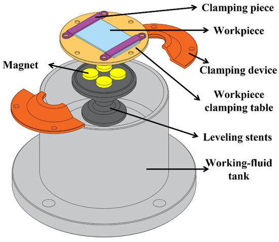 The leveling stents are fixed and clamped on the bottom of the working fluid tank with two clamping devices. The workpiece clamping table is attracted to the top of the leveling stents through four powerful magnets on the bottom annular boss, and the clamping piece and bolts fix the two ends of the workpiece. The exploded views are shown in Figure 8, and the physical figure is shown in Figure 9.