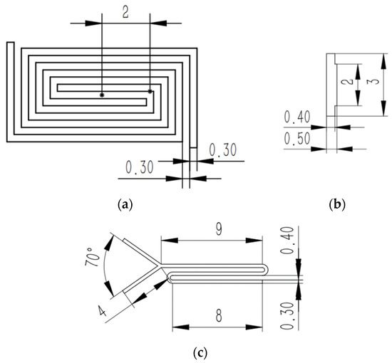 The size of the back-shaped array micro-channel is shown in Figure 12a, and the height of the micro-bulge of the template tool is 0.5 mm. The size of the step-shaped straight groove micro-channel is shown in Figure 12b, and the width of the micro-bulge of the template tool is 0.3 mm. The size of the Y-curved runner micro-channel is shown in Figure 12c, and the micro-bulge height of the template tool is 0.5 mm.