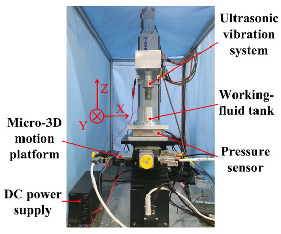 The electrophoretically assisted micro-ultrasonic machining machine tool of the micro-channel is shown in Figure 13. The pressure sensor is installed on the micro three-dimensional motion platform through the adapter plate, the working fluid tank is installed on the pressure sensor, the template tool is affixed to the lower end face of the ultrasonic vibration system with 3M double-sided adhesive, and the ultrasonic vibration system is installed on the vertical sliding table through the supporting arm.