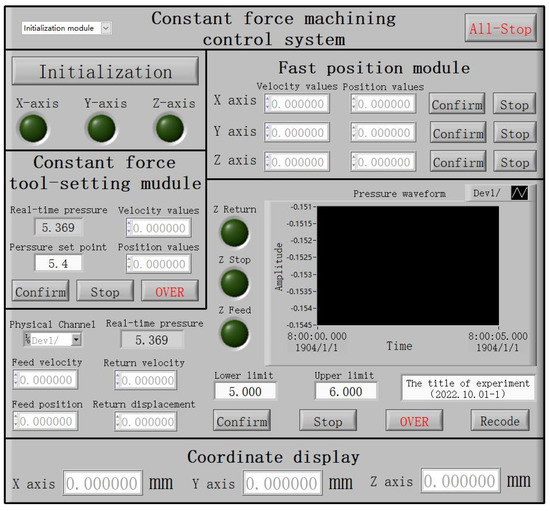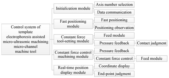 The control system architecture of the electrophoretically assisted micro-ultrasonic machining micro-channel machine tool is shown in Figure 14. It includes an initialization module, fast positioning module, constant force tool setting module, constant force control machining module, and real-time position display module.
