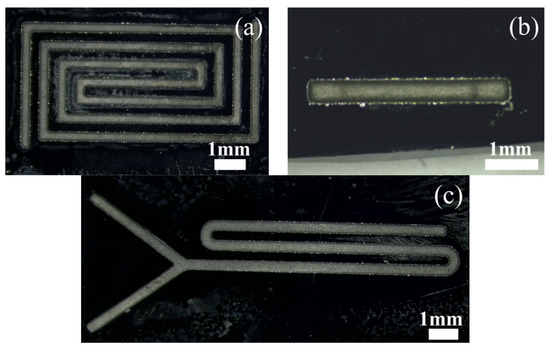 According to the principle of template-based electrophoretically assisted micro-ultrasonic machining, and to meet the needs of micro-channels used in different situations, three different micro-channel shapes are designed in this paper. They are a back-shaped array micro-channel (Figure 11a), a step-shaped straight groove micro-channel (Figure 11b), and a Y-curved runner micro-channel (Figure 11c).