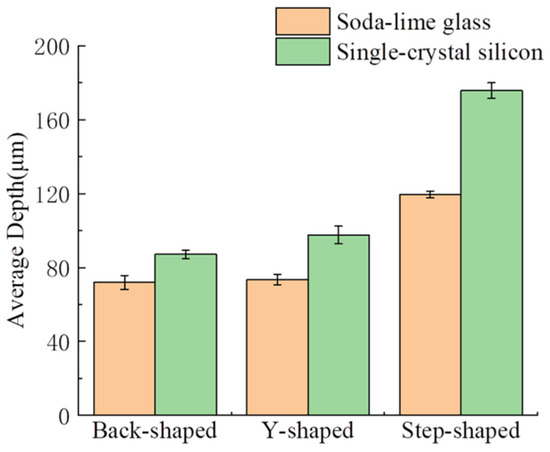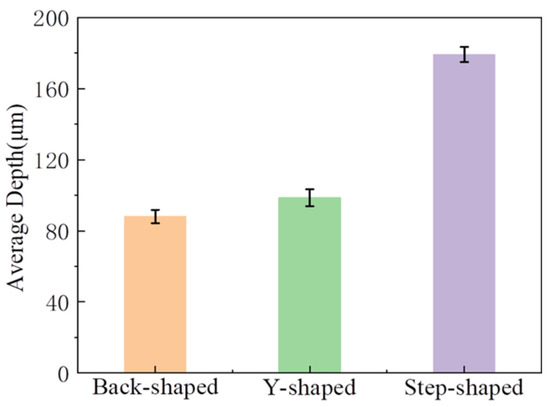 Because the volume of the micro-channel with complex shapes is difficult to calculate, and it is difficult to obtain relatively accurate data, the average depth of the micro-channel is used as the evaluation index of machining efficiency. The comparison of different shapes and depths is shown in Figure 20. It is observed from the diagram that when machining micro-channels of different shapes on non-conductive monocrystalline silicon, the machining rate of stepped micro-straight grooves is the highest. This is because, among the three shapes, the contact area between the step-shaped micro-straight groove micro-bulge structure and the workpiece is the smallest. Under the same energy, the larger the cross-sectional area of the micro-bulge structure, the smaller the tool end amplitude, and the impact of the wear particles on the workpiece decreases, which affects the machining rate. Furthermore, when the cross-sectional area is larger, it is more difficult for the wear particles to enter the machining area evenly. The utilization rate of wear particles in the working fluid decreases, and the machining rate decreases.