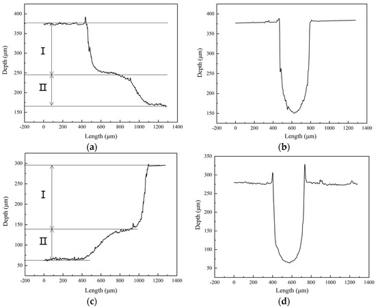 As shown in Figure 22, the height of the second step of the silicon substrate is about 80 μm, and in the soda-lime glass substrate, it is about 74 μm, but in the template tool, it is 100 μm. We found that this is because, after the step is formed, the abrasive particles in the working fluid easily accumulate at the first step due to the constraints of the raised step structure of the tool and the impact on the junction of the first and second steps under the action of ultrasonic vibration such that the height difference of the second step is minor. “I” is the first step, “II” is the second step.