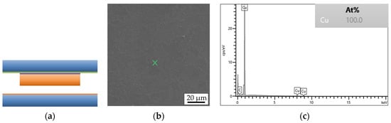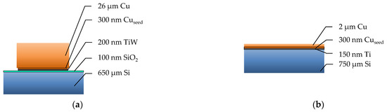 There are various solutions to this problem, including etching by formic acid directly in the bonding chamber [6], wet etching [7], plasma treatments [8,9], and passivation with permanent or temporary protective layers. A complex control system for the chemistry in the bonder is required for the formic-acid approach. Wet etching is a simple technique, but it cannot avoid re-oxidation of Cu during the transportation to the bonding chamber. Plasma treatments require complex and costly equipment. Permanent coatings are usually thin metal coatings (i.e., Au [10], Pd [11], Al [12], electroless Ni—immersion Au or ENIG [13], etc.). In the case of Au and Pd, there is an issue of fast diffusion of Cu into the passivating metal, which causes Kirkendall voids and reliability issues. In the case of Al and ENIG, the resistivity of the interconnect increases due to these coatings.