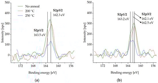 Figure 4 highlights that the S2p spectra intensities decrease with increasing desorption temperature, which is also connected to the SAM desorption [21,34]. No oxidized S species, which would occur at >166 eV [35,36], can be detected either before or after the desorption procedures.