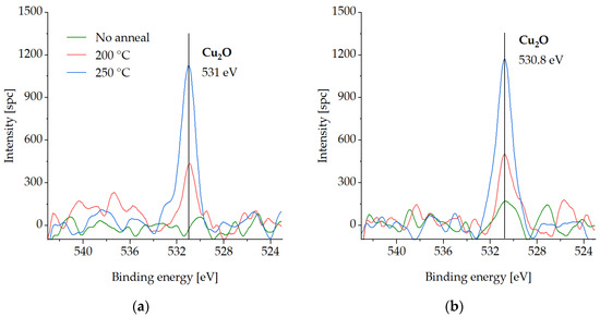 No O peak is detected for the sample before the SAM desorption (Figure 5). The intensity of oxygen significantly increases with temperature. The peaks at 530.8–531 eV can be attributed to the presence of Cu2O [35,37].