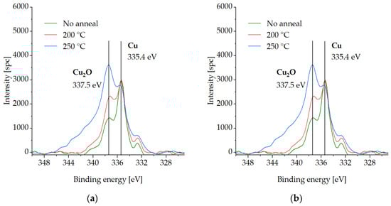 Figure 6 shows the increase in Cu2O at 337.2–337.5 eV with desorption temperature. Cu2O is normally situated at the distance of 2 eV from the Cu peak at 335.4 eV. CuO, which should lie 1-eV higher than the Cu peak, is not detected [33,38,39].