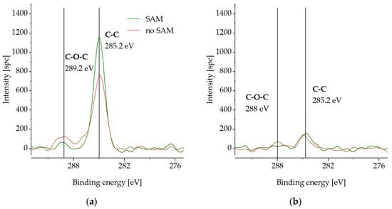 In the initial state (Figure 8a), the intensity of C1s is higher for the SAM sample because of the C-backbone of the monolayer. Both samples exhibit a slight peak at 289.2 eV which corresponds to O-C=O bindings [40], although the intensity of the peak is lower for the SAM sample. It is worth noting that the SAM samples without storage, as well as the annealed samples (Figure 3), do not show any of the O-C=O bindings. This is typical only for the samples exposed to the atmosphere at a low temperature for a longer time.