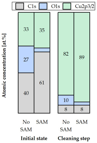Figure 11 summarizes the distribution of the atomic concentrations of the elements above on the Cu surface after the storage test. In the initial state, the C-percentage is higher for the SAM sample (61 at.%) in comparison to the uncoated sample (40 at.%), which is caused by the CH-backbone of the thiolate. The O concentration is 27 at.% for the die without SAM in comparison to 4 at.% for the passivated die. After the cleaning step, 10 at.% of the O species is left on the Cu surface for the sample without SAM, whereas the coated sample exhibits 3 at.%. The amount of C is 8 at.% for both dies after the cleaning step.